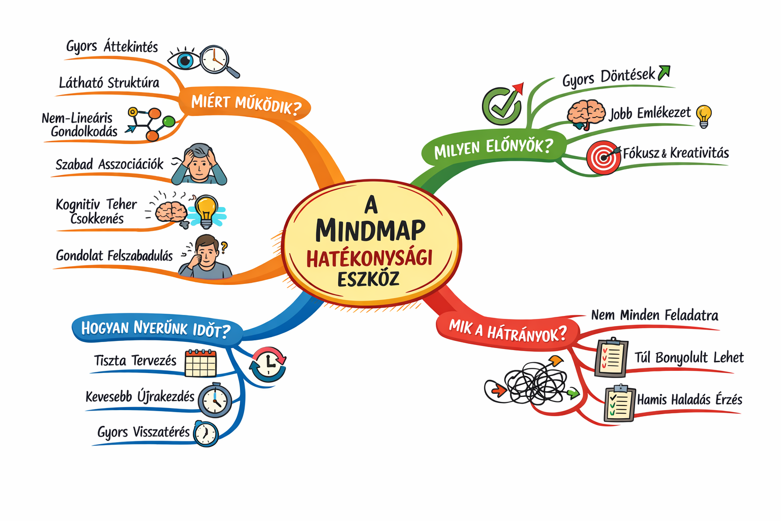 Érdemes megemlíteni azt is, hogy a mind map nem mindenkinek és nem minden helyzetben ideális eszköz. Ha te alapvetően lineárisan gondolkodsz, és listákban, lépésekben, sorrendekben érzed magad biztonságban, akkor a mind map nem feltétlenül gyorsít, sőt akár lassíthat is. Ugyanez igaz akkor is, ha nem vagy éppen vizuális típus. A sok ág, szín és kulcsszó egyszerre nem mindenkinél hoz tisztább gondolkodást.
